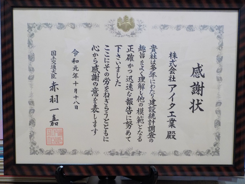 この度、国土交通省より建設統計調査に関しまして、感謝状をいただきました。