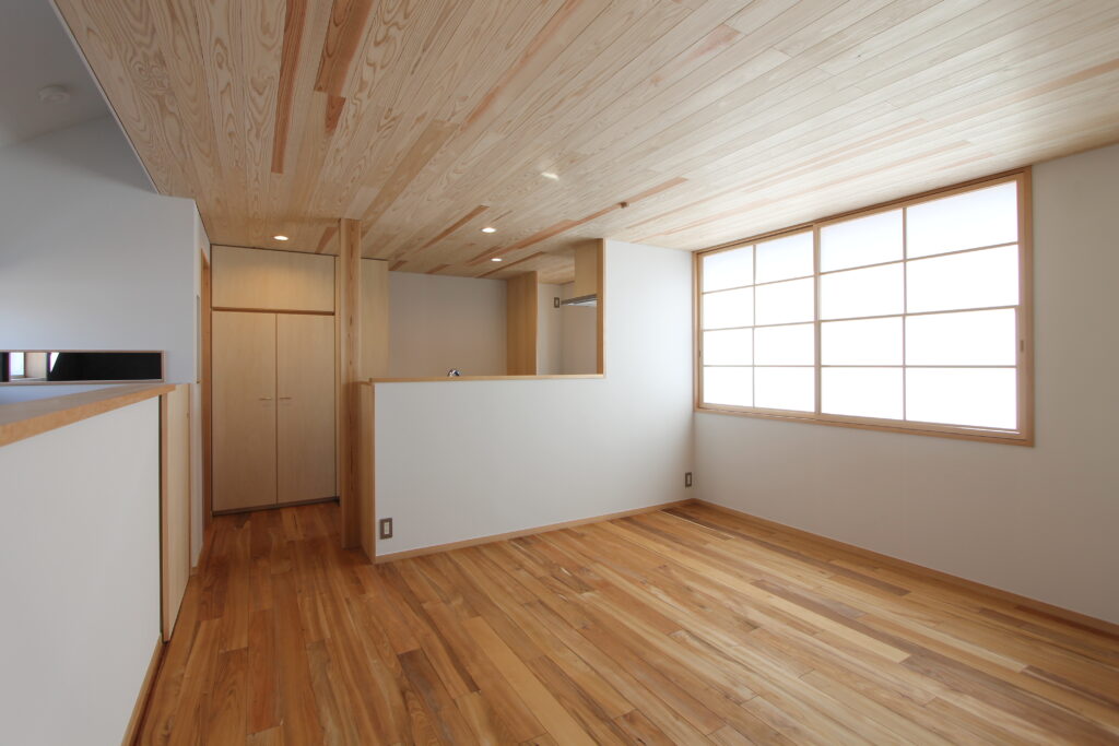 天井材を板材にすることで、木質感がアップし、木の温もりが感じられるとても落ち着きのある空間となります。