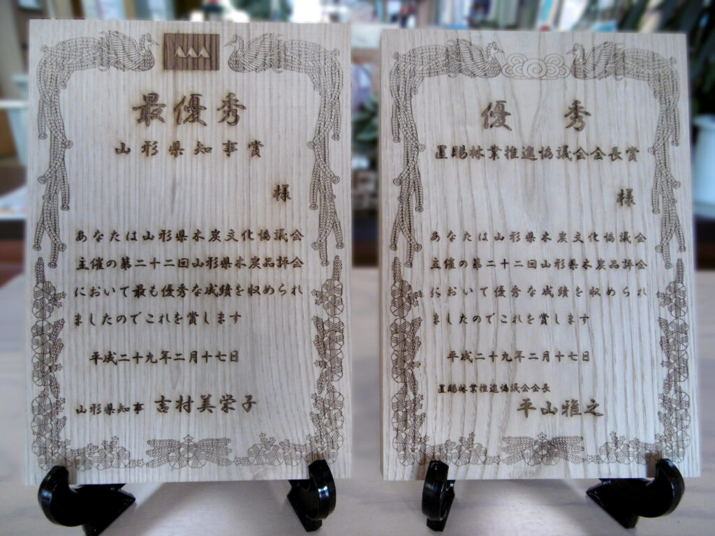 山形県木炭品評会の最優秀賞と優秀賞の木製表彰状を製作しました。