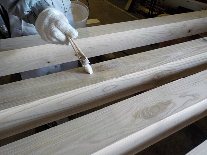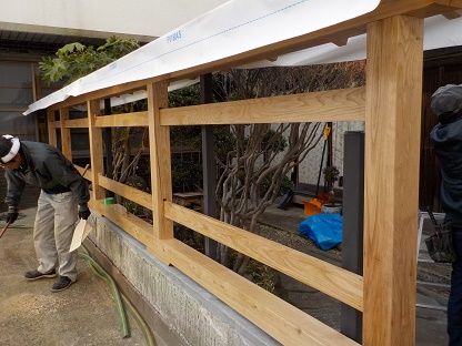 材料は、土台や柱・桁に栗、板塀には朴、板塀の間に黒竹を使用、材料全てに液体ガラスを施工し、強度と防腐・防蟻性能を強化しました。