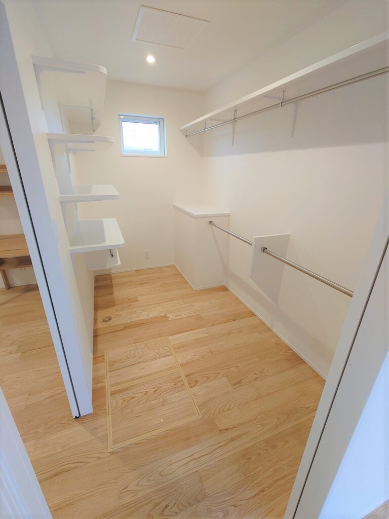 ウォーキングクローゼットも栗フローリングで統一されて
