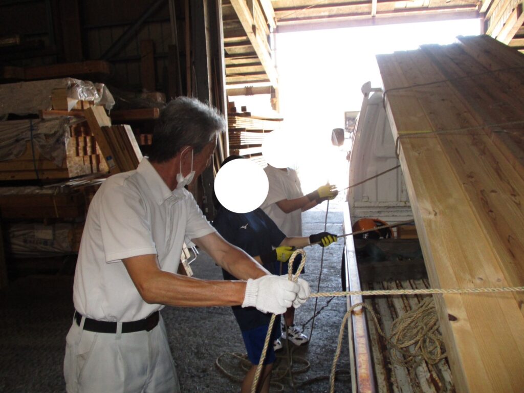 営業部門では現場の配達に合わせて資材運搬の積載とロープ固定