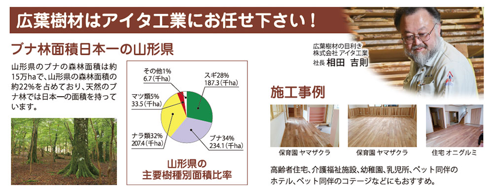 アイタ工業では、山形県産をはじめとする国産の広葉樹無垢材にこだわって、お部屋のサイズに合わせてフローリング材として加工・販売をしております。数平米からでもご注文受付いたしますので、住宅のリフォーム用として一般の方もお気軽にお見積ご依頼ください。