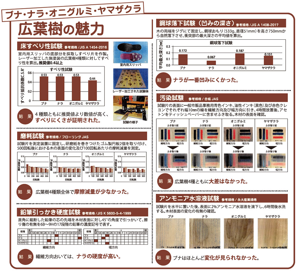 当社では試験・評価結果を踏まえ、用途に合った樹種・仕様をご提案しています。