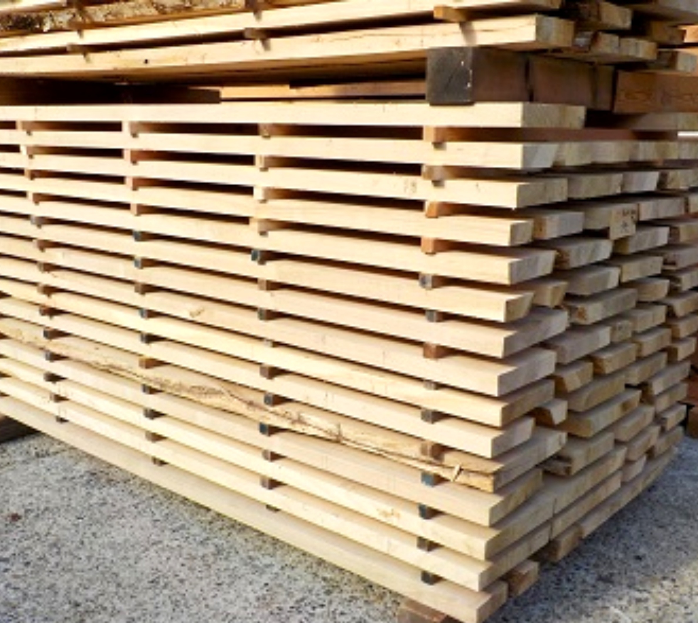 製材後、産地・樹種ごとに桟積みを行います。