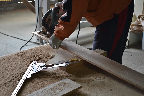また、フローリング板の短手方向の側面に隣の板と噛み合うように凸凹の加工(エンドマッチ加工)を施します。