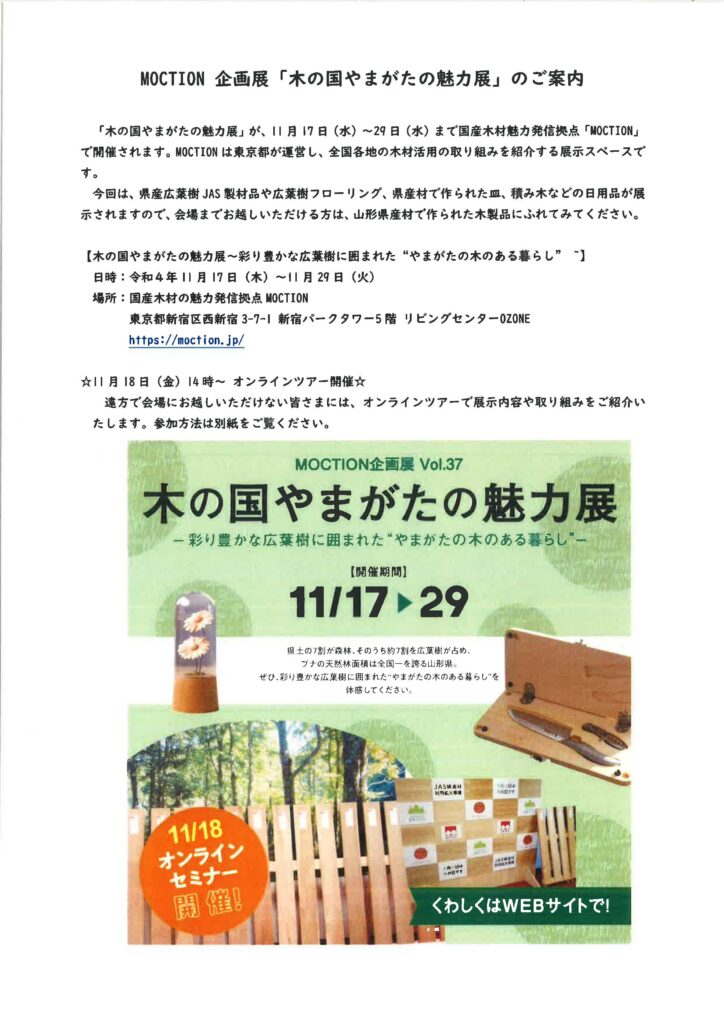 「木の国やまがた」の紹介と共に広葉樹製品(広葉樹板や木のうつわetc)を展示します。
